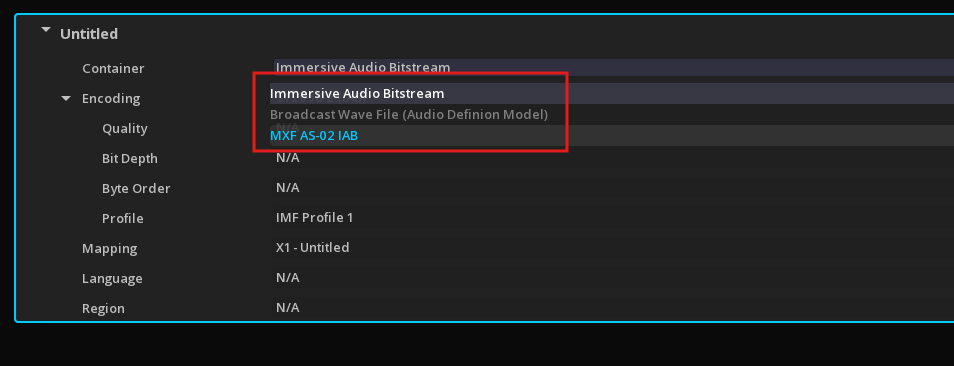-> Select MXF AS-02 IAB (SMPTE ST 2067-201: Immersive Audio Bitstream Level 0 Plug-in standard).