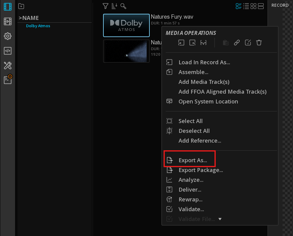 This function allows you to quickly export a standalone Dolby Atmos file, keeping the source file attributes (start time code, metadata, etc.).