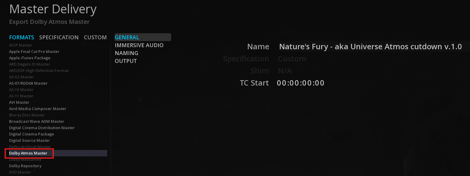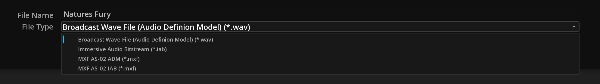 - BWF ADM - Broadcast Wave File with Audio Definition Model, using Dolby Atmos profile.