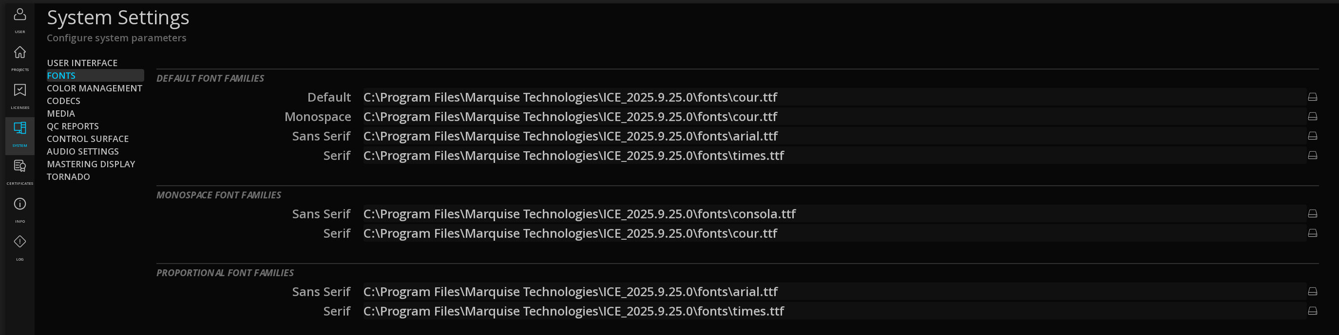 It is possible to define default fonts for all your new projects. Fonts can also be changed manually for a composition. The Default font settings are located in SYSTEM > FONTS To modify the default font for each family of fonts, click the Drive icon ...
